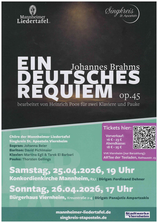 Die Mannheimer Liedertafel singt gemeinsam mit dem Singkreis St. Aposteln ein deutsches Requiem von Johannes Brahms in Mannheim und Viernheim.